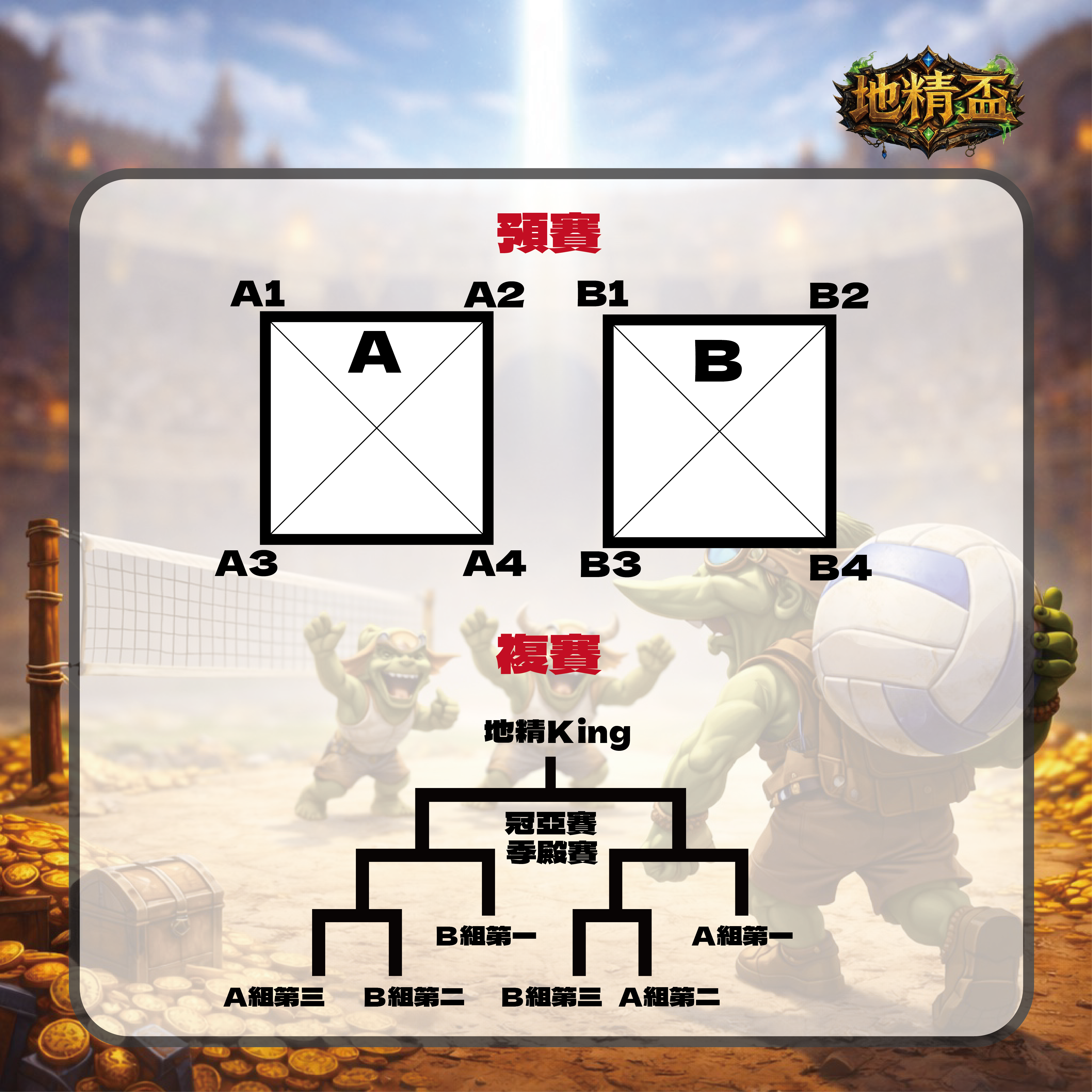 - 預賽循環分AB兩組,2026/04/30 20:00 直播抽籤決定分組,比賽場地為WOOHA SPORTS CLUB。