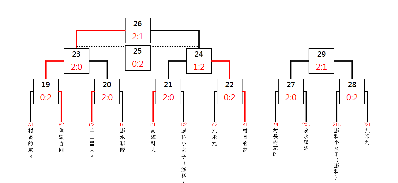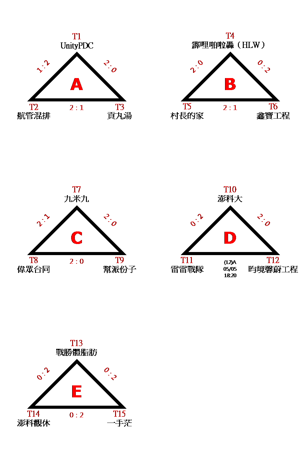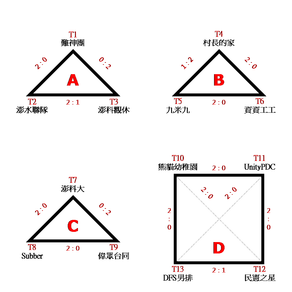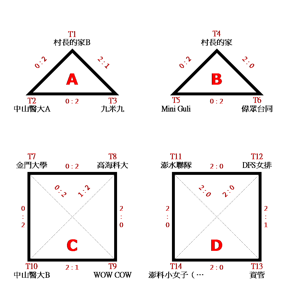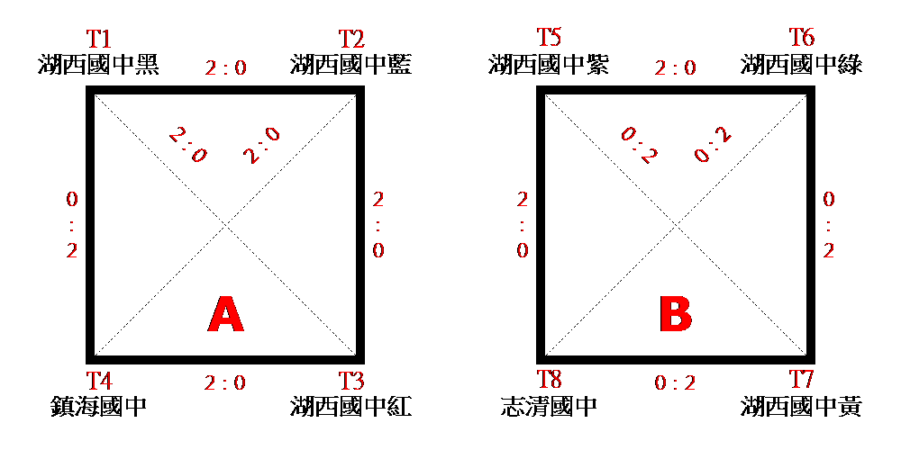預賽21分,決賽25分 1.初賽(預賽)各分組取前2名晉級複賽(決賽)。 2.複賽(決賽)錄取前5名。 ※抽籤說明:①各分組冠軍抽T1、T4、T5、T8,亞軍抽T2、T3、T6、T7 ②預賽同組球隊決賽前二輪須避開。