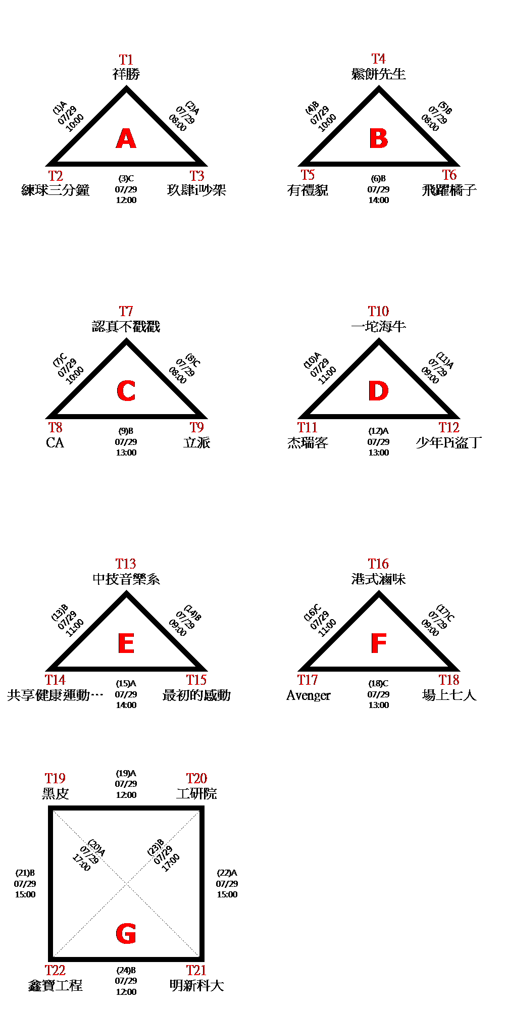 22隊,分6組三角及1組四角,三角循環分別取一名、四角循環取二名,晉級決賽 決賽賽程為單淘汰制,需抽籤