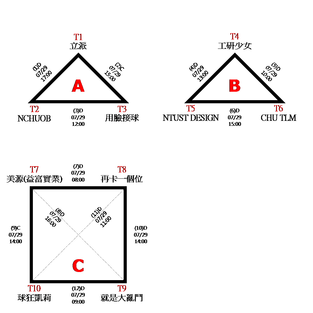 10隊,分為二組三角循環,一組四角循環,三角取一、四角取二晉級決賽 決賽為單淘汰制,需抽籤