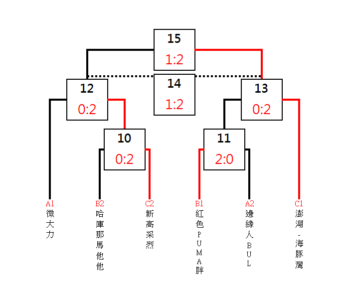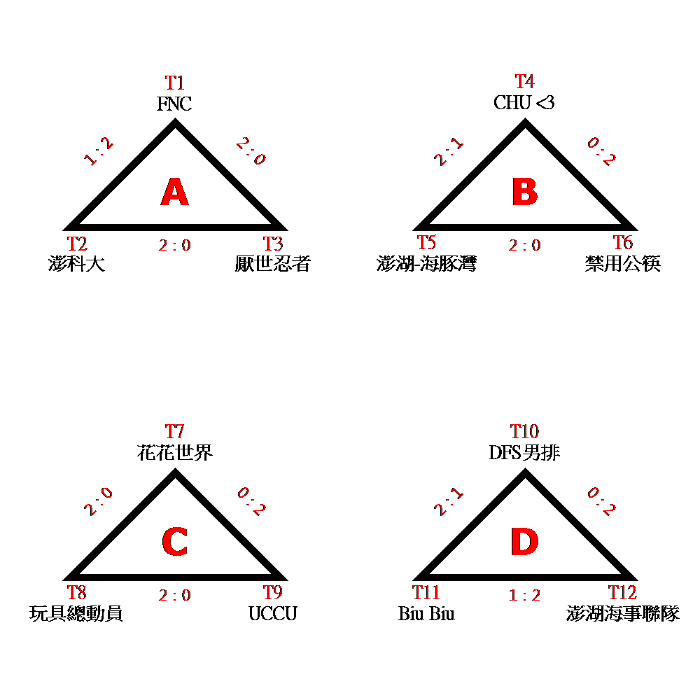 預賽:各分組取2晉級決賽。 複賽:各分組冠軍抽T1、T4、T6;亞軍抽T2、T3、T5 ※取3名頒獎