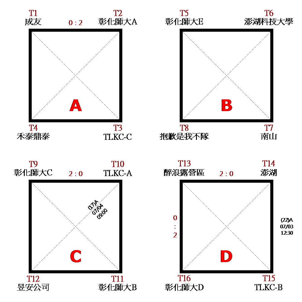 1.初賽(預賽)分組ABCD取二名,晉級決賽。