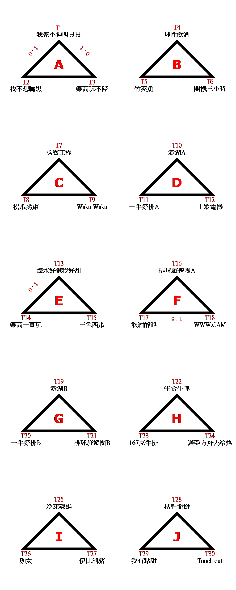 1.初賽(預賽)分組ABCDEFGHIJ取一名,晉級決賽。