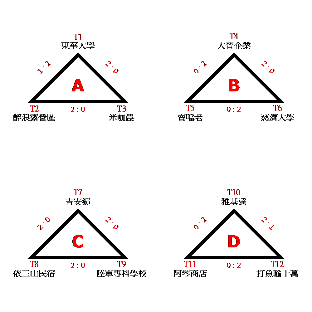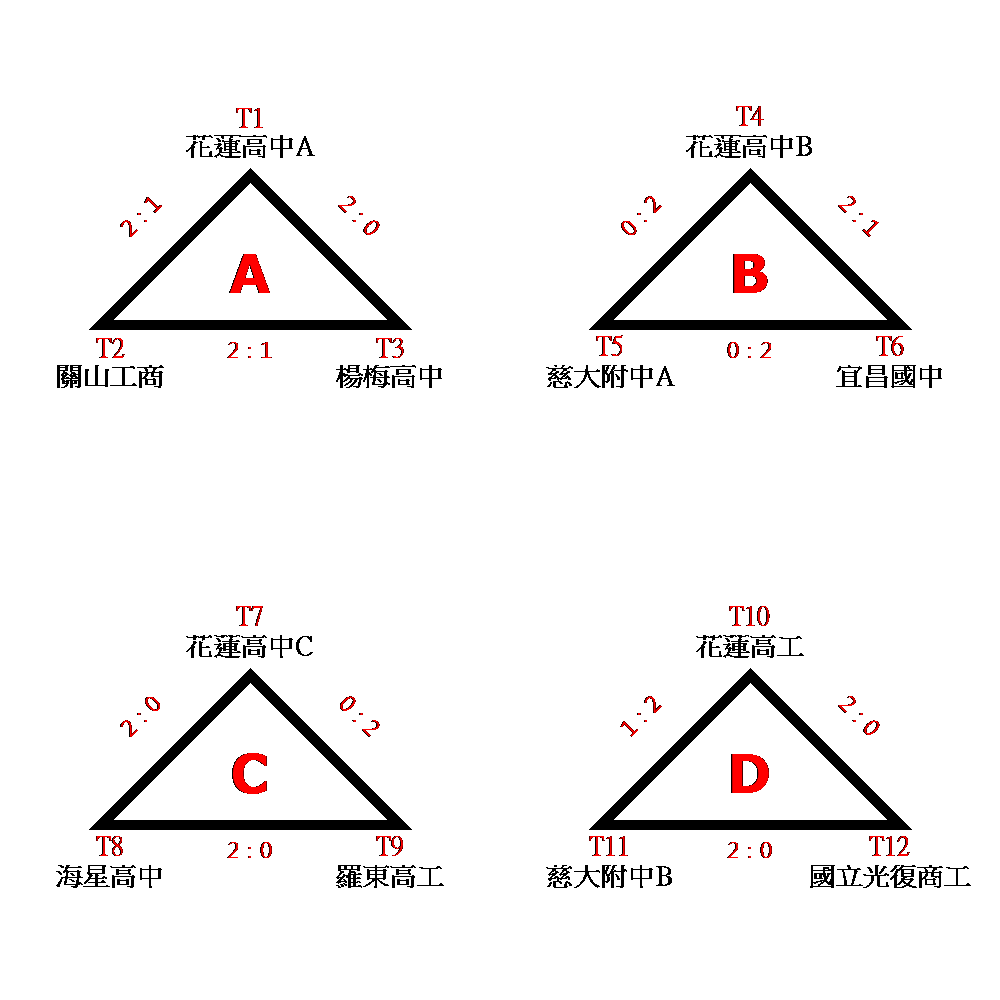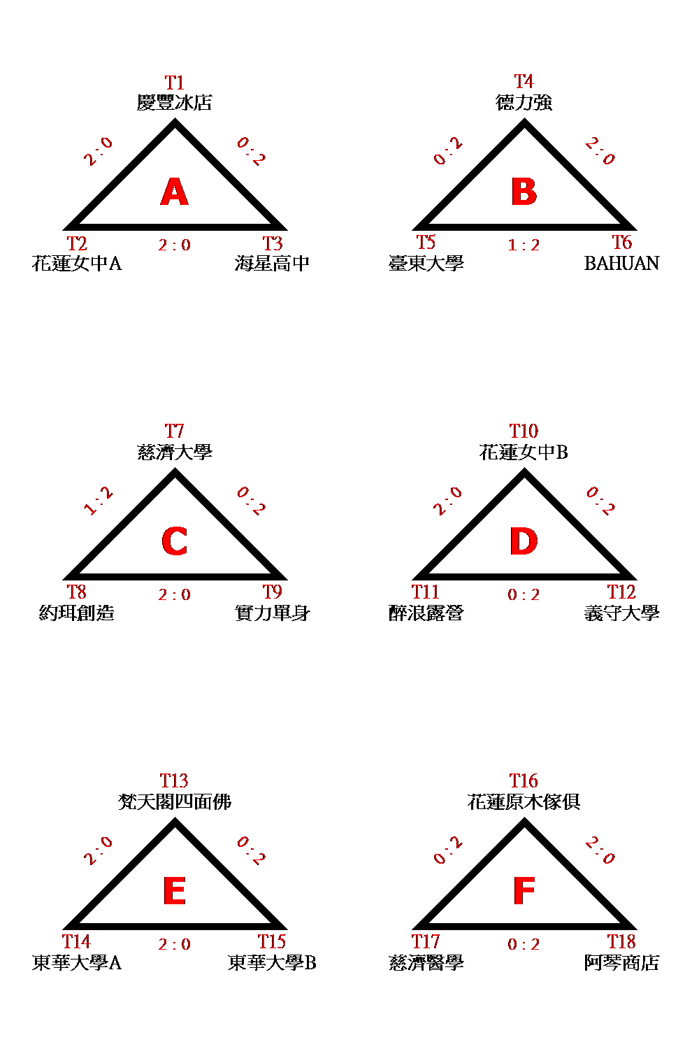 公開女子組複賽 T1=A1、T2=F2、T3=B2、T4=E1、T5=D2、T6=C1、T7=D1、T8=F1、T9=A2、T10=E2、T11=C2、T12=B1