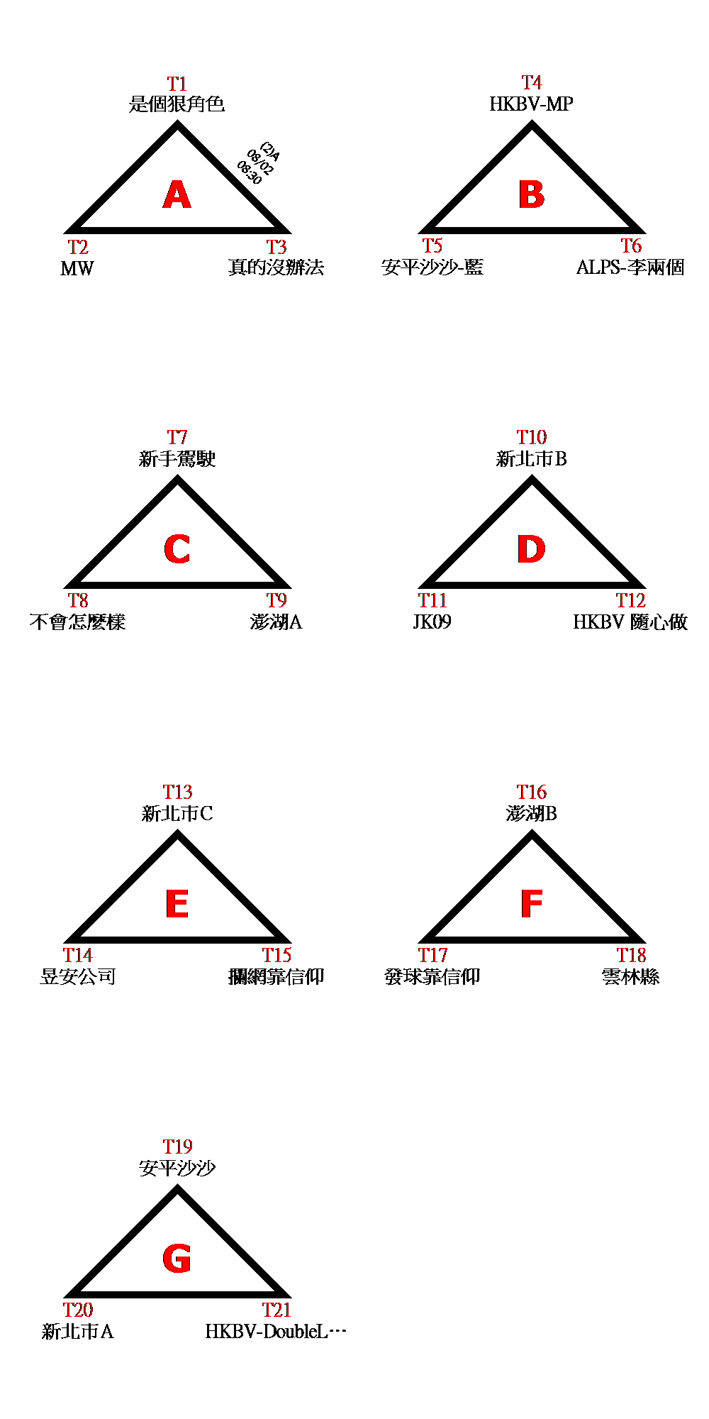 1.初賽(預賽)分組ABCDEFG取二名,晉級決賽。