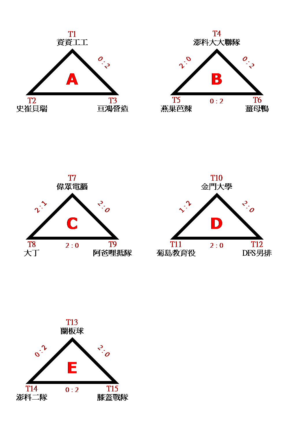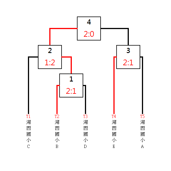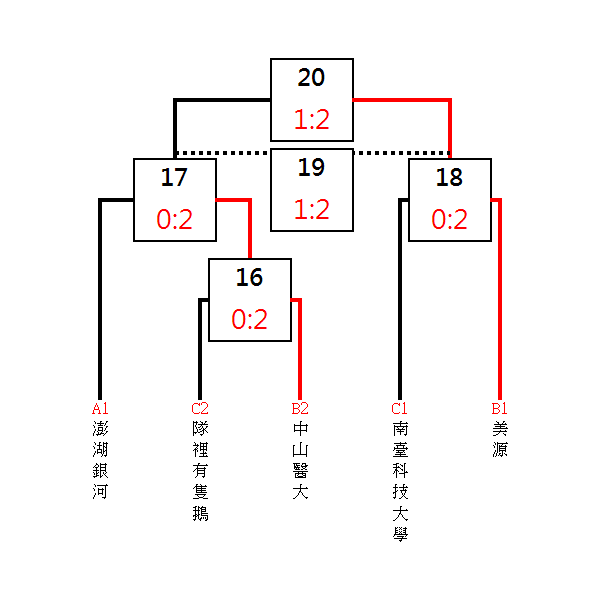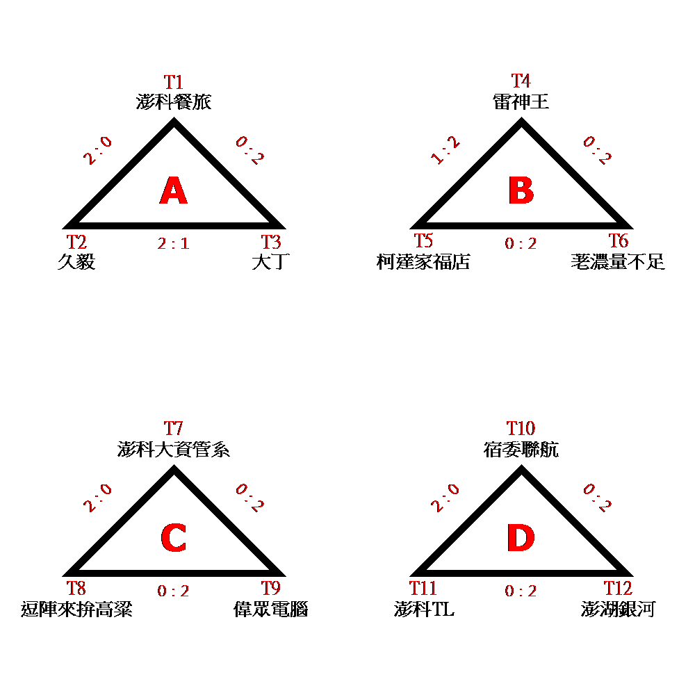 初賽:A組取一、B、C組取二、晉級複賽。 複賽:取前四名。 備註:複賽抽籤說明 A.初賽(預賽)各分組冠軍抽T1、T3、T5號籤,分組亞軍抽T2、T4號籤 B.如抽中T2、T3之隊伍在預賽為同組者,全部將在重新抽籤。