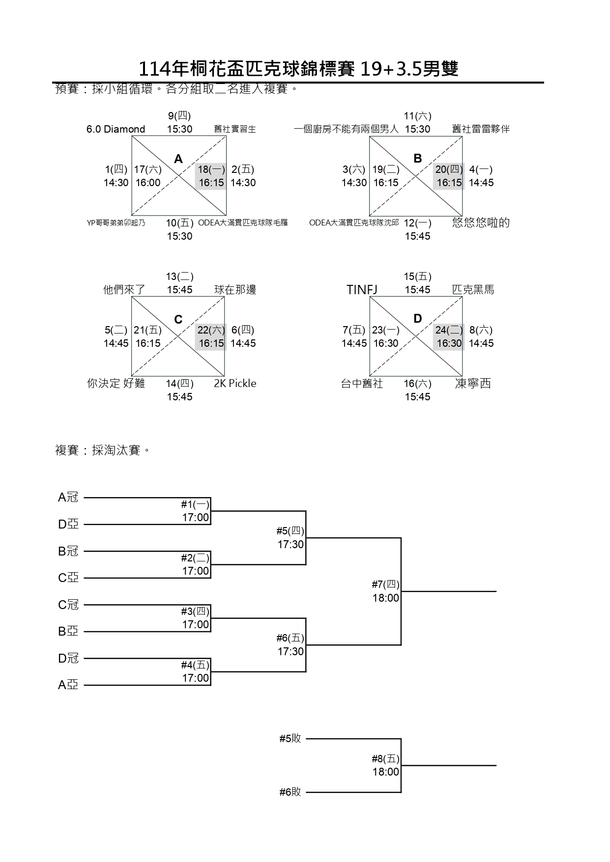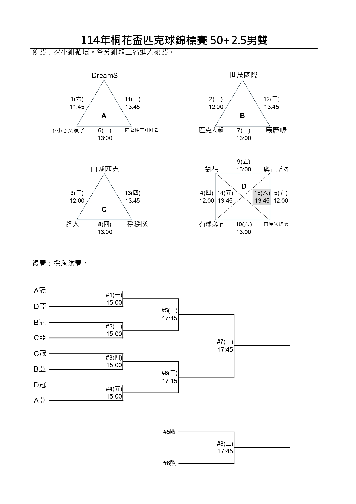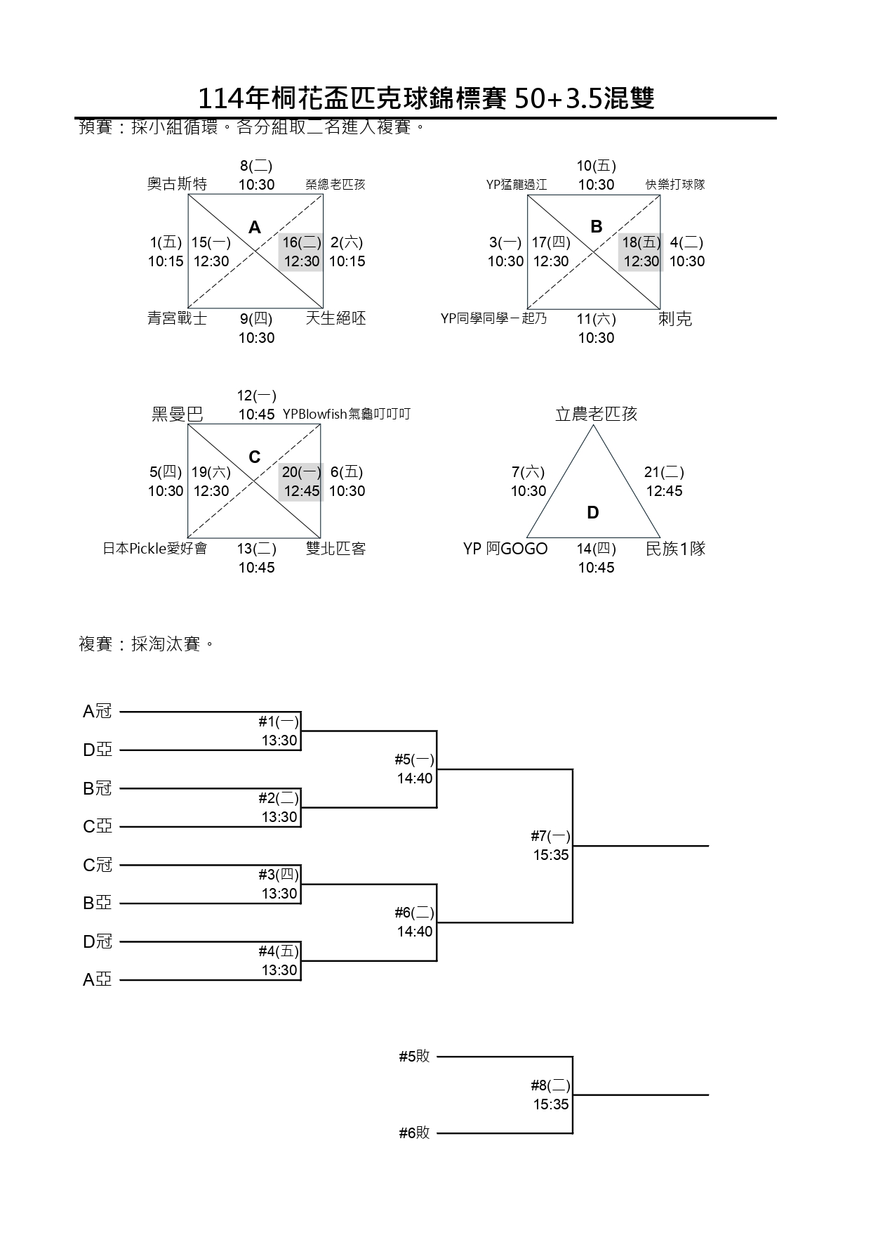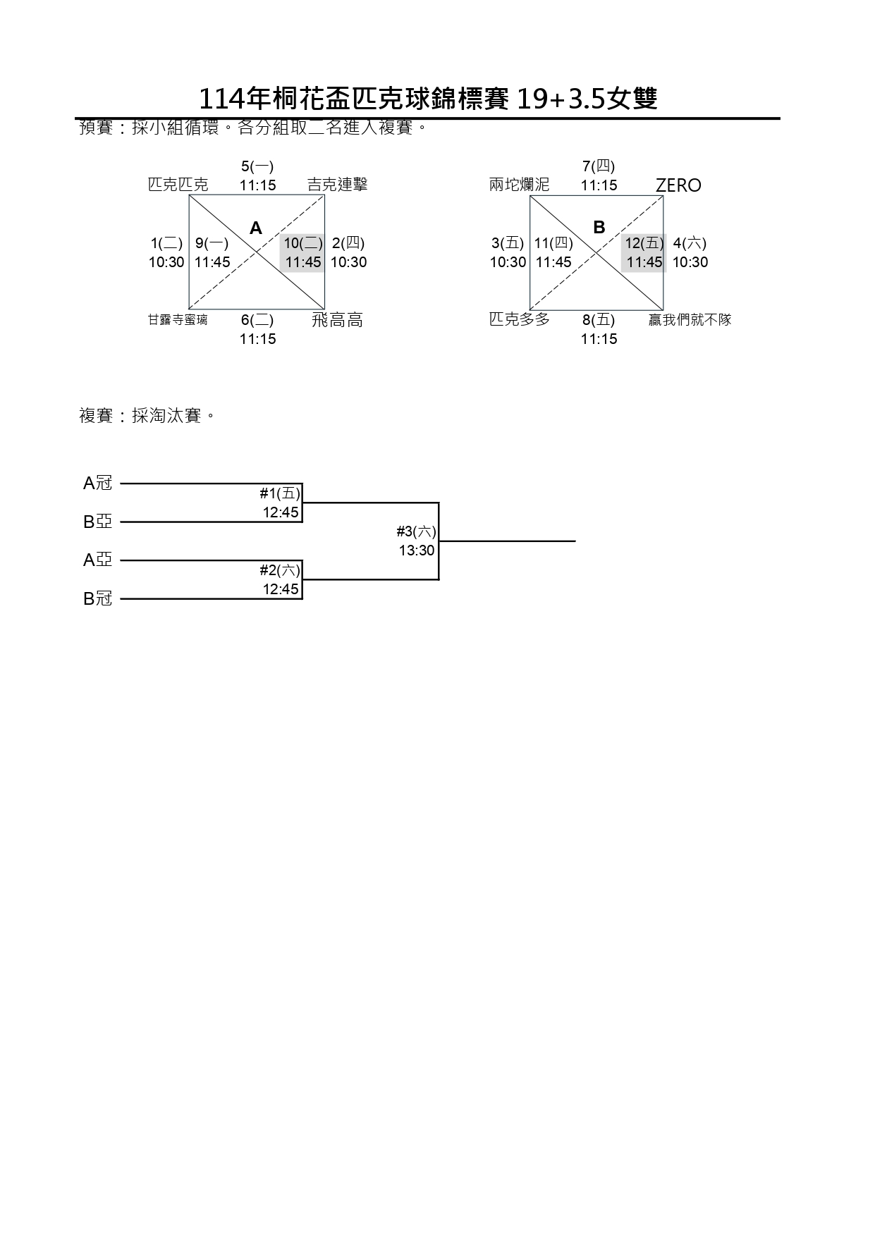 114新北市桐花盃第一屆匹克球錦標賽-賽程時間圖