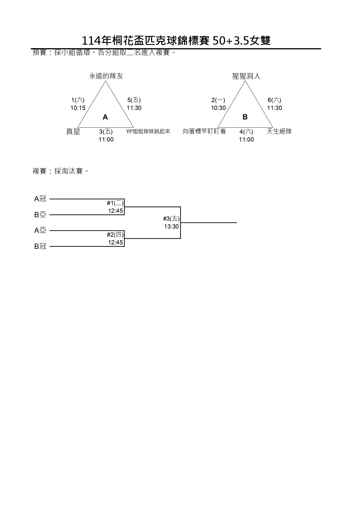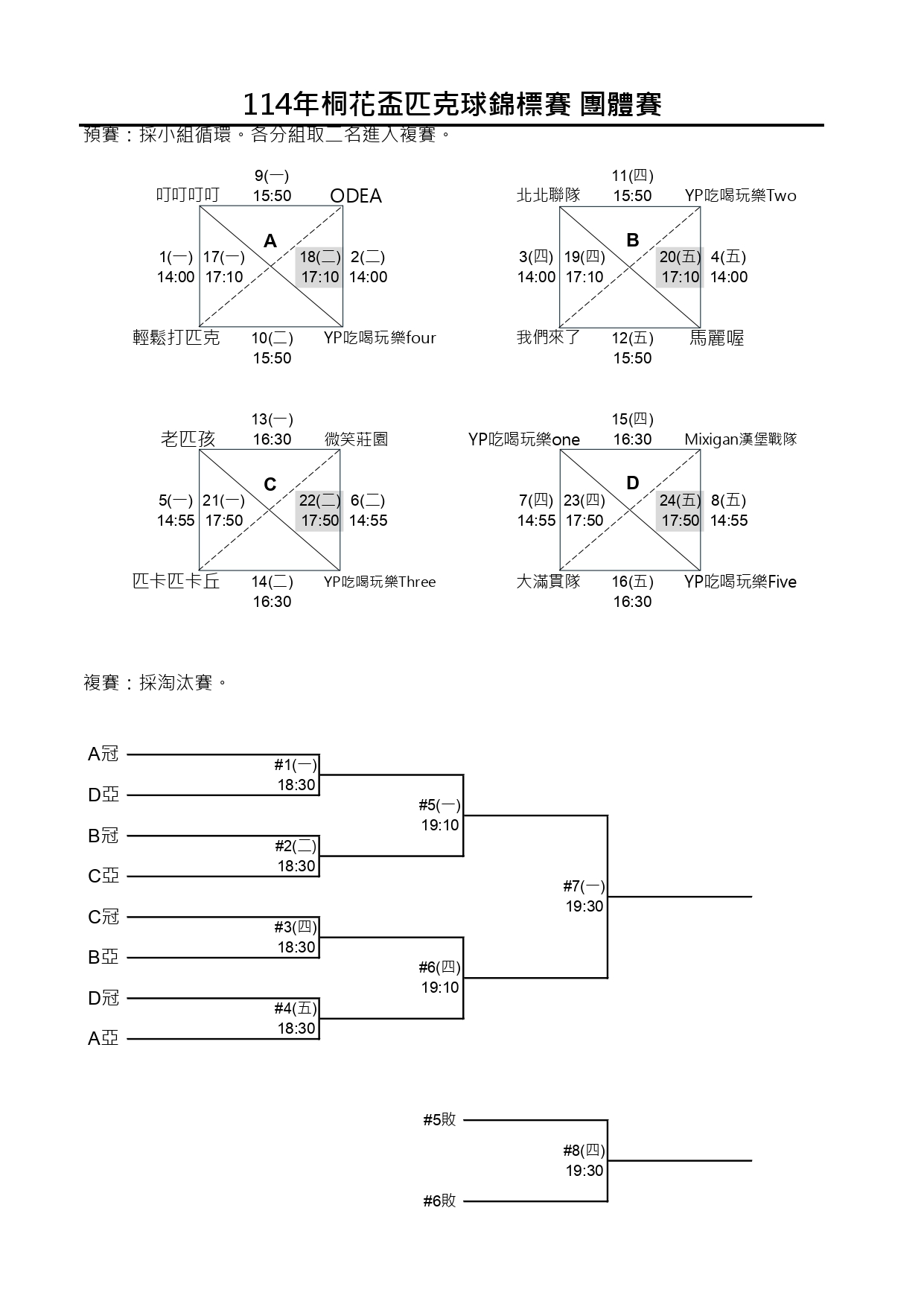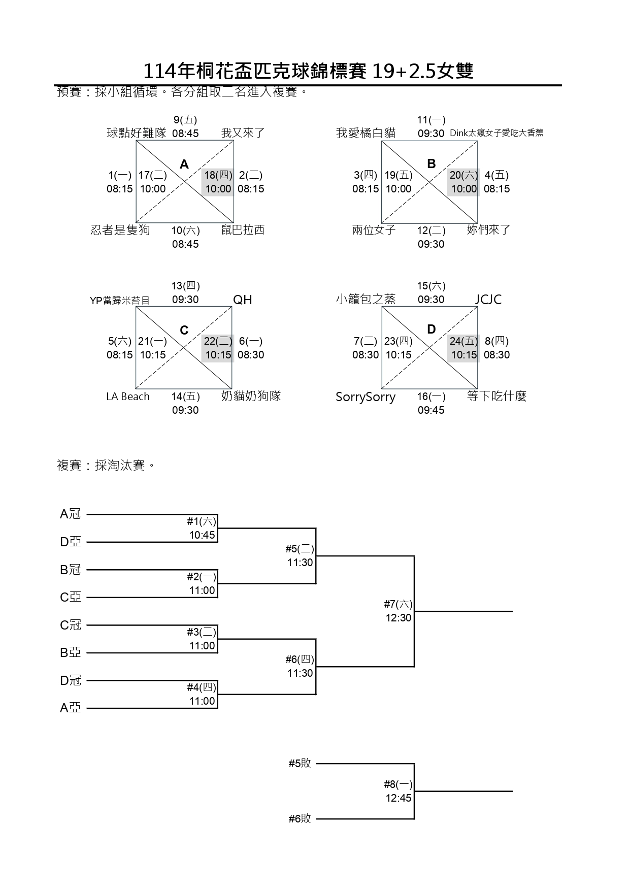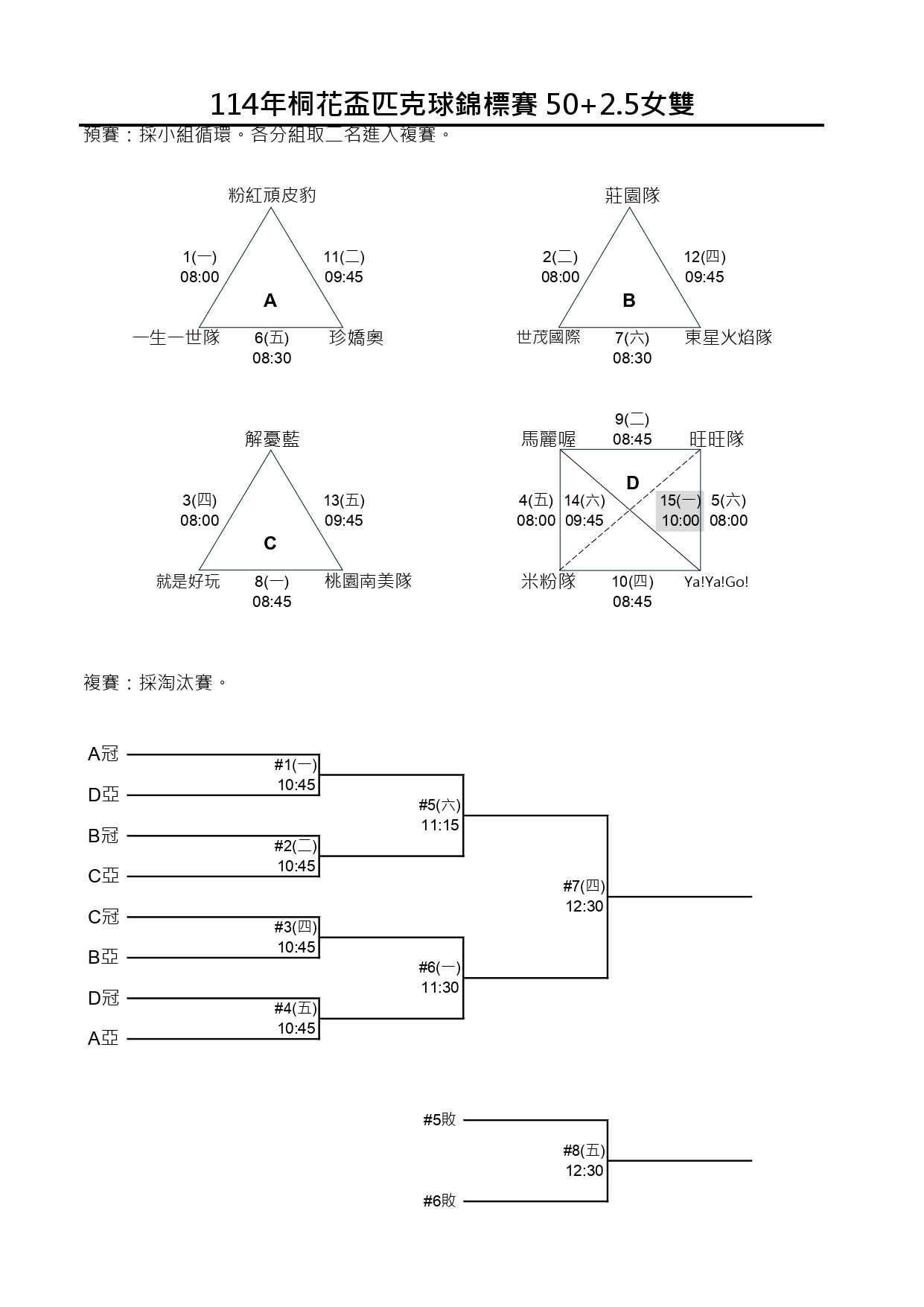 114新北市桐花盃第一屆匹克球錦標賽-賽程時間圖