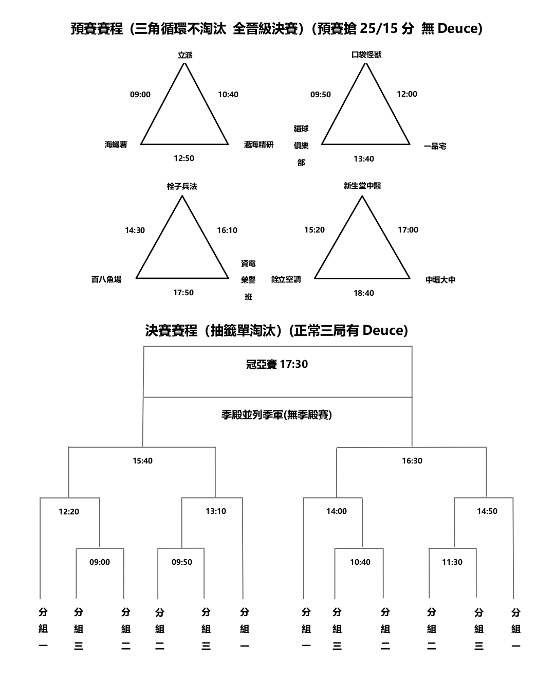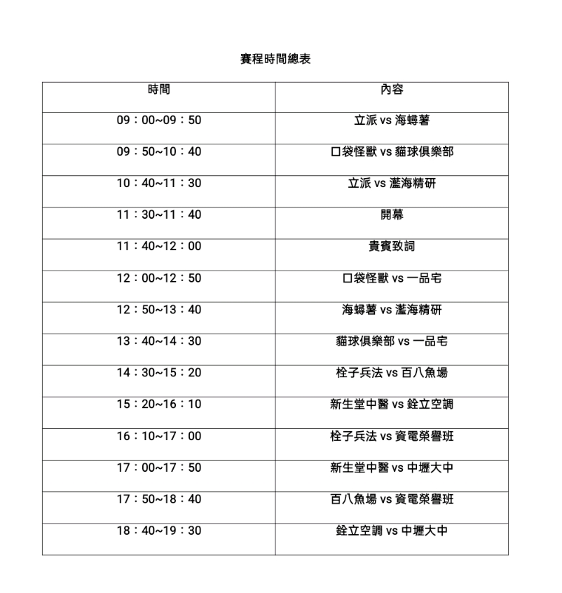 因12/20(六)中午開幕儀式,故稍微更動賽程時間,麻煩各隊賽程表和時間表兩相對照。
