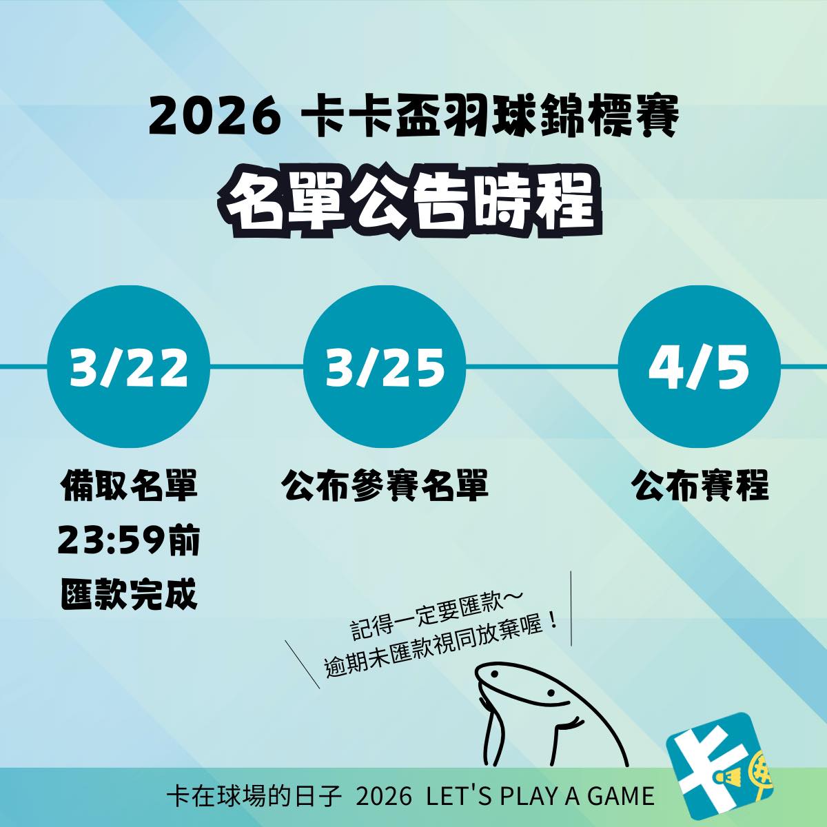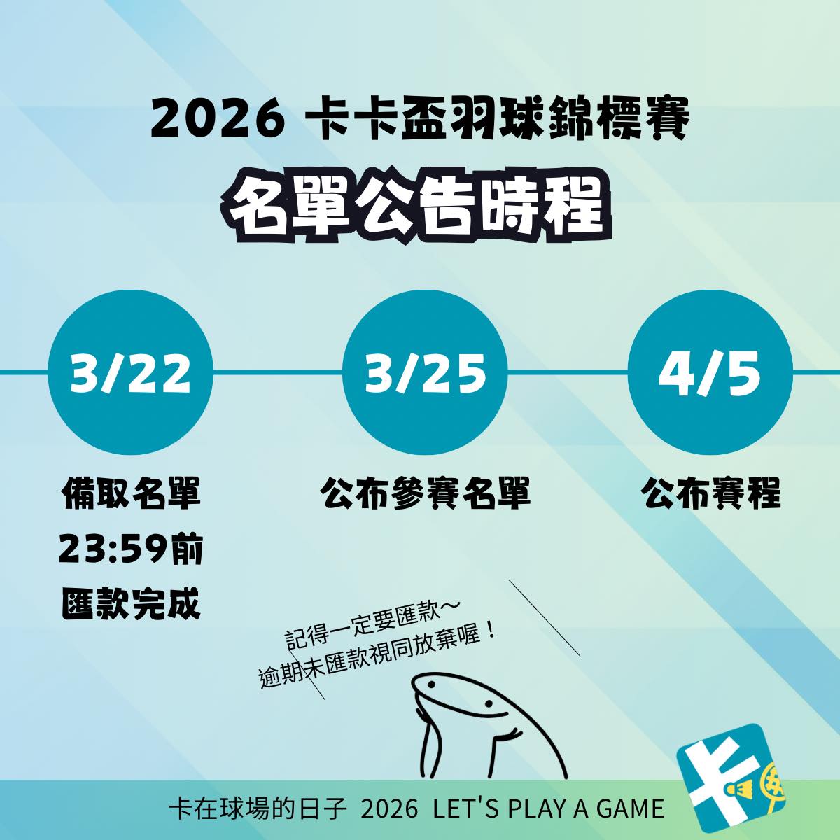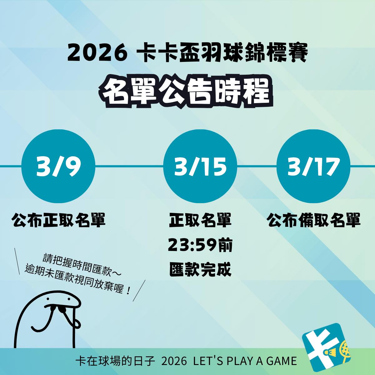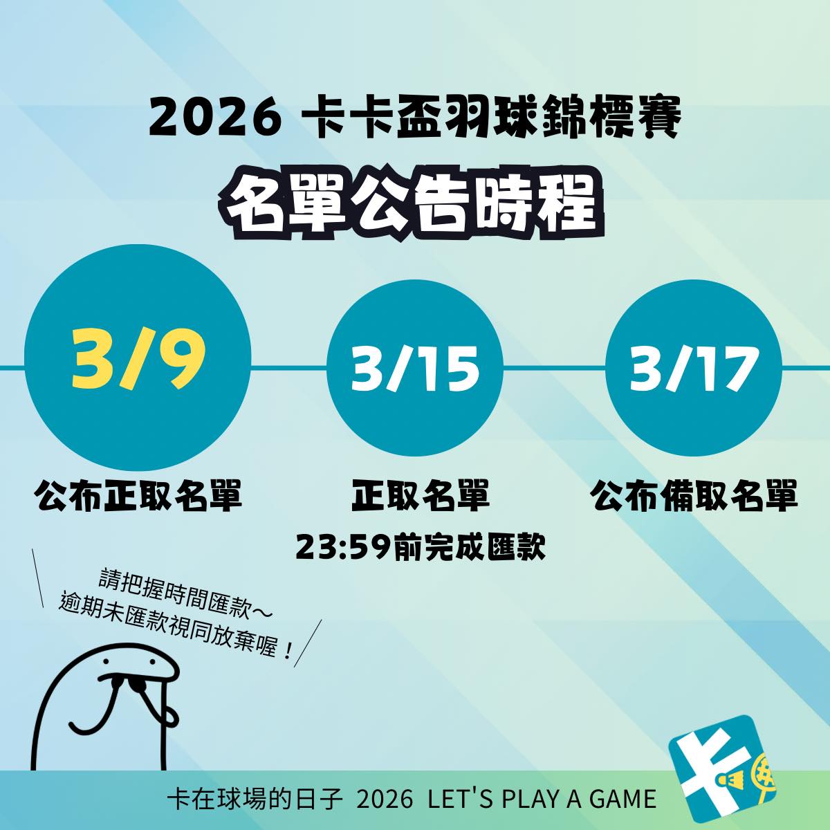 3/9-3/15 正取匯款時間 3/17 公布備取名單 3/17-3/22 備取匯款時間 3/25 公布最終參賽名單 4/5 公布賽程