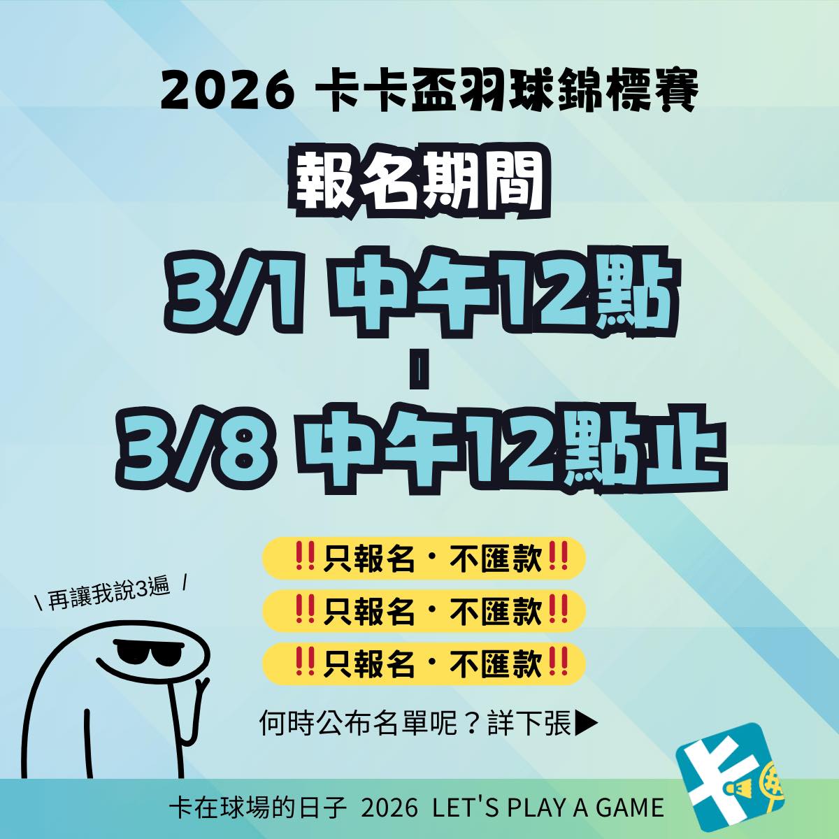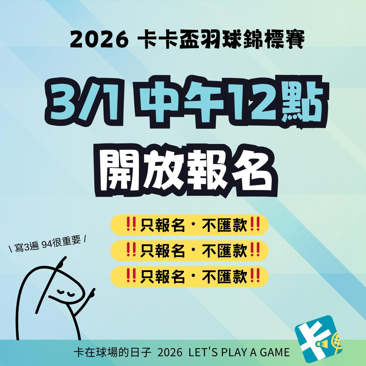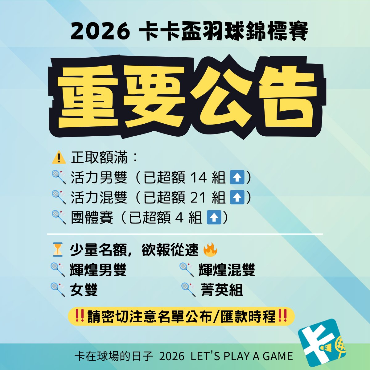 社會女雙組最終報名20組,因此釋出 4 組名額調整至「活力混雙」,希望能讓更多球友一起參與卡卡盃!