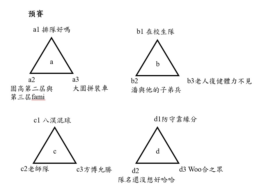 冠軍/ 潘與他的子弟兵 亞軍/ 方博允勝 季軍/ 排隊好嗎 殿軍/ 隊名還沒想好哈哈