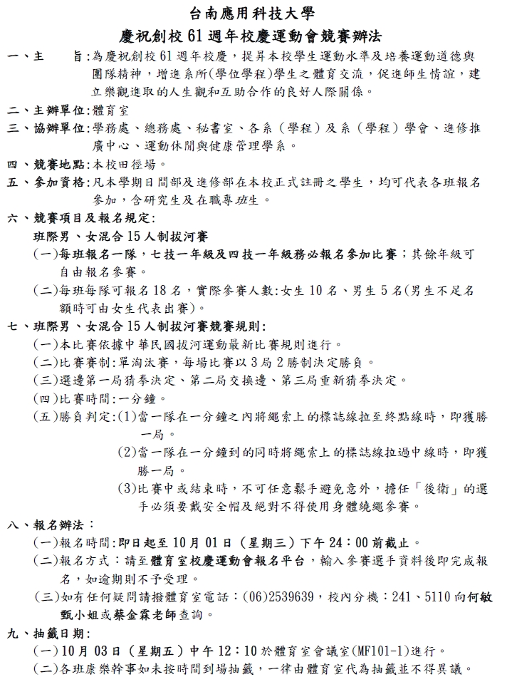 協辦單位:學務處、總務處、秘書室、各系(學程)及系(學程)學會、進修推 廣中心、運動休閒與健康管理學系