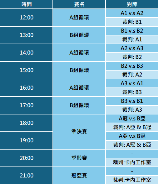 9. 比賽制度:如附表(AB兩組三取二循環,分組冠打分組亞,勝利則晉級冠亞)