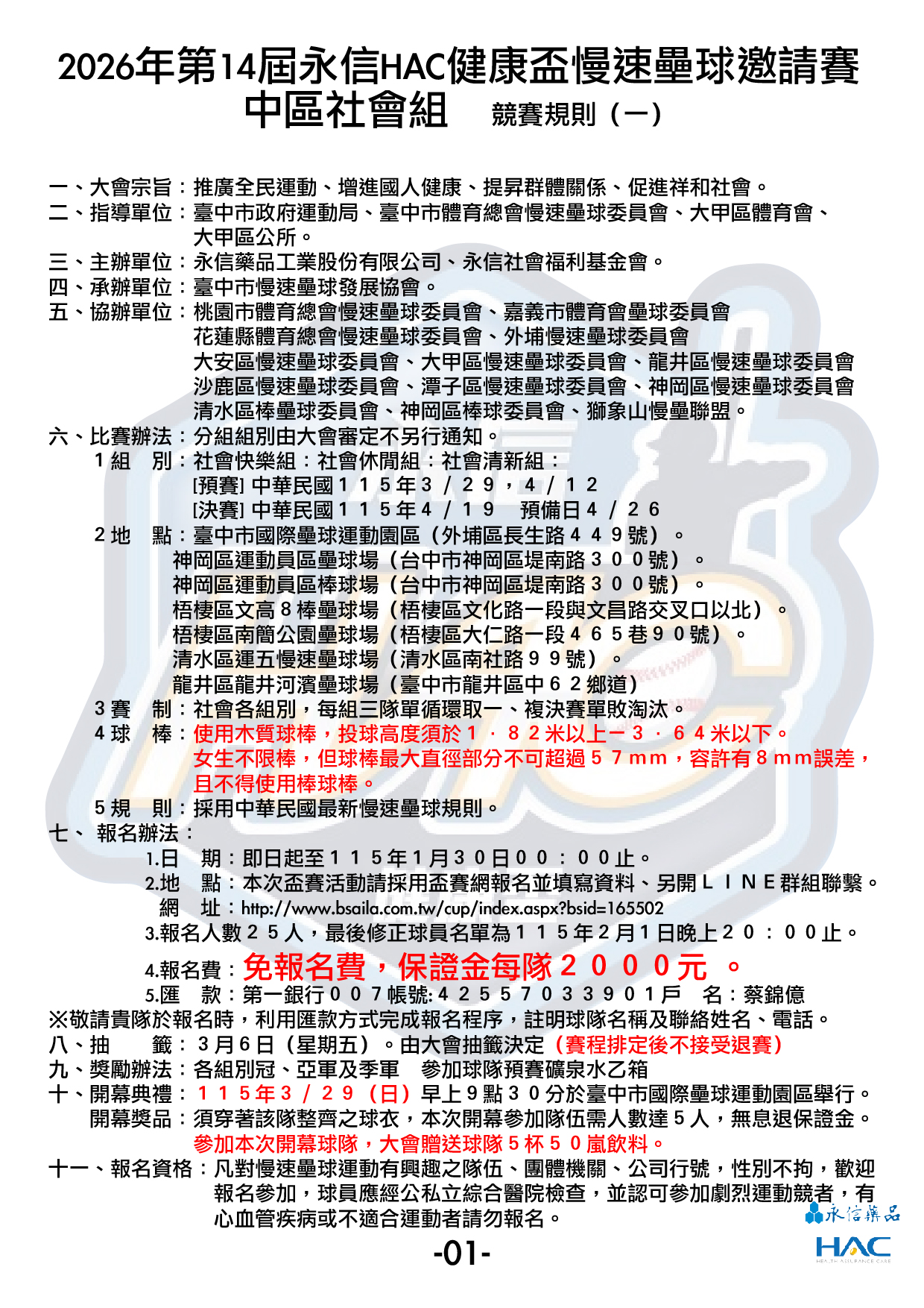 指導單位:臺中市政府運動局、臺中市體育總會慢速壘球委員會、大甲區體育會、大甲區公所。